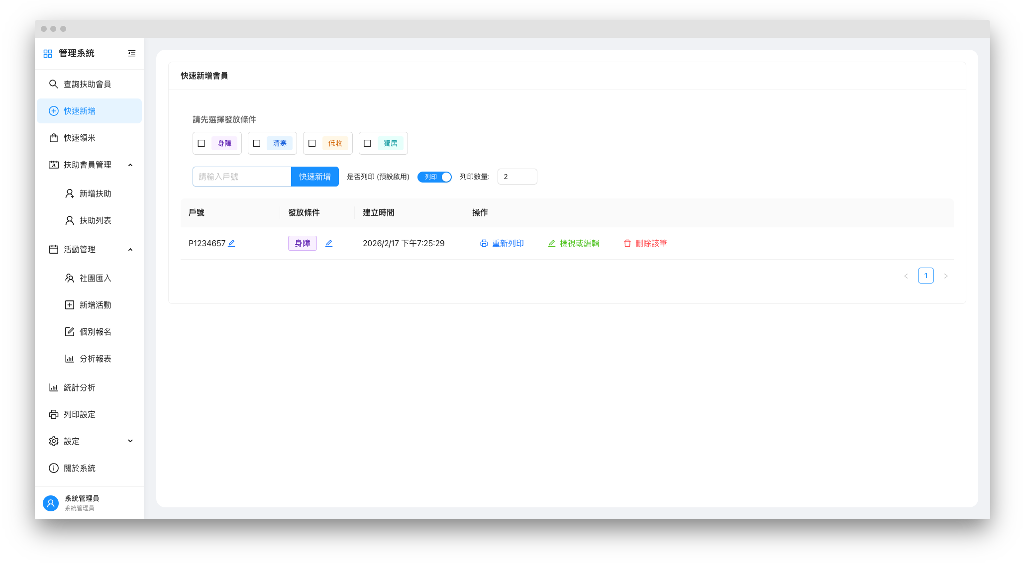 針對現場高流量場景設計的「快速新增」功能。志工只需選擇發放條件、輸入戶號,系統自動建檔並列印條碼標籤。支援自訂列印數量,操作步驟壓縮至最少,年長志工也能輕鬆上手。