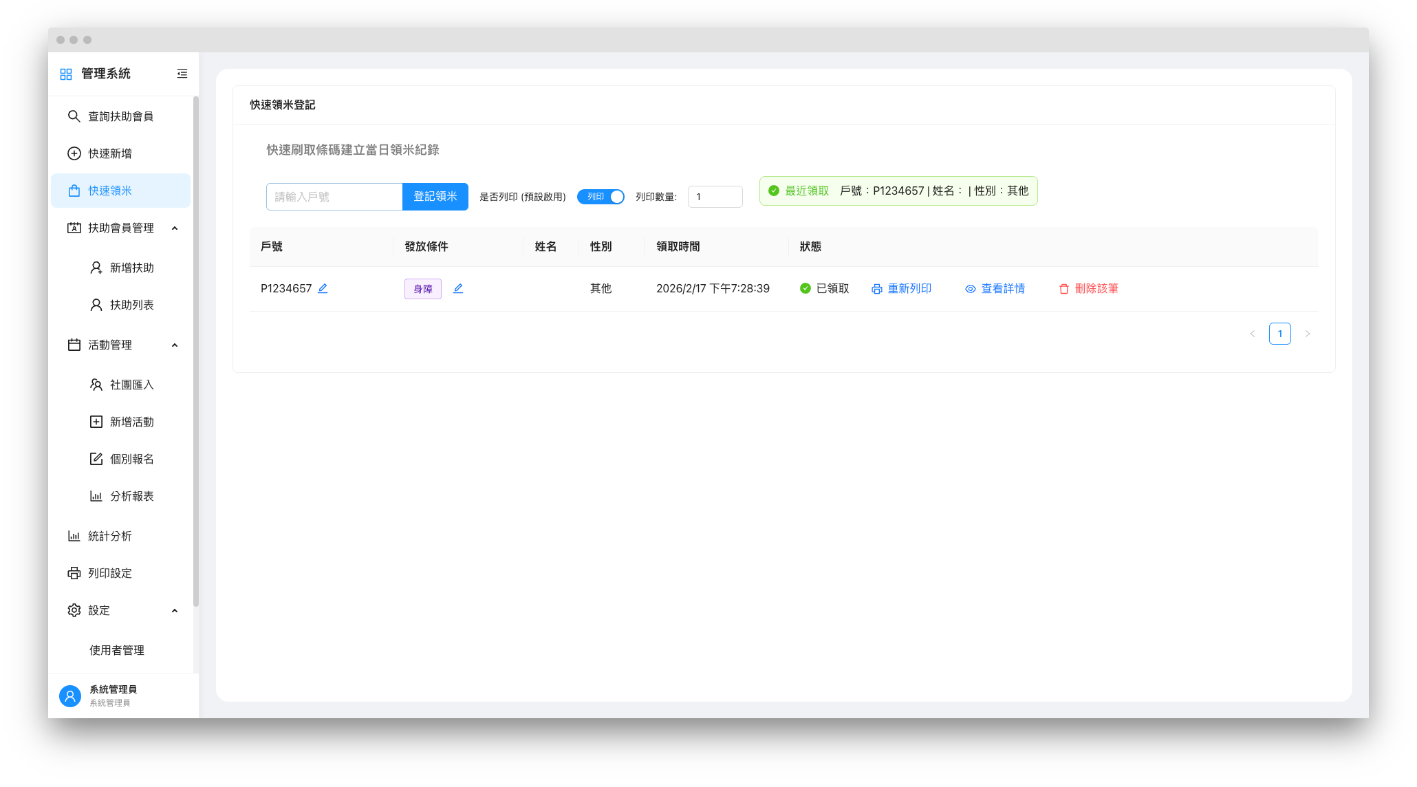 發放現場的核心操作介面。條碼掃描後系統即時顯示匹配結果(戶號、姓名、性別),一鍵完成登記領米。支援重新列印、查看詳情等快捷操作,每筆紀錄即時寫入資料庫。